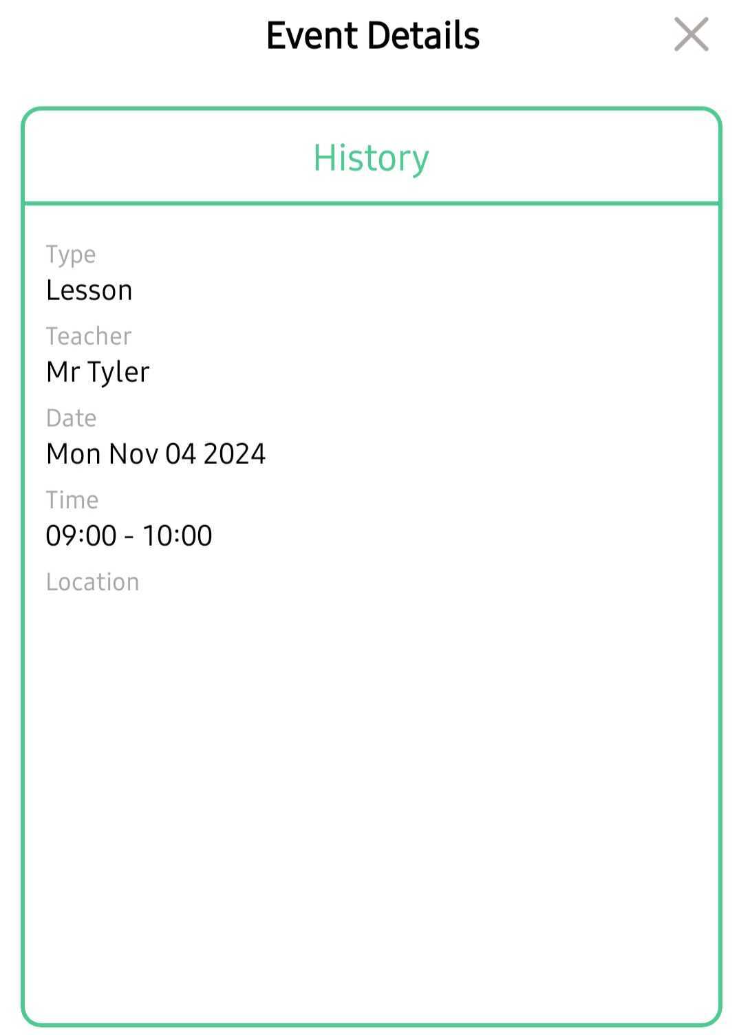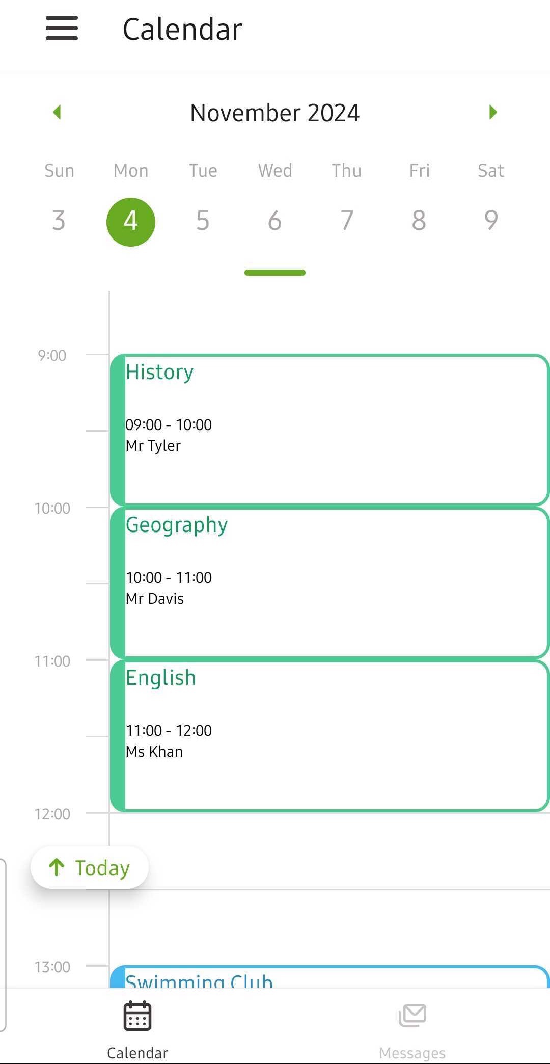 The calendar section allows students to see upcoming events recorded in their timetables such as lessons, lunches, and clubs. Each calendar event will display the name, the room, the time and date, and the staff member leading it.