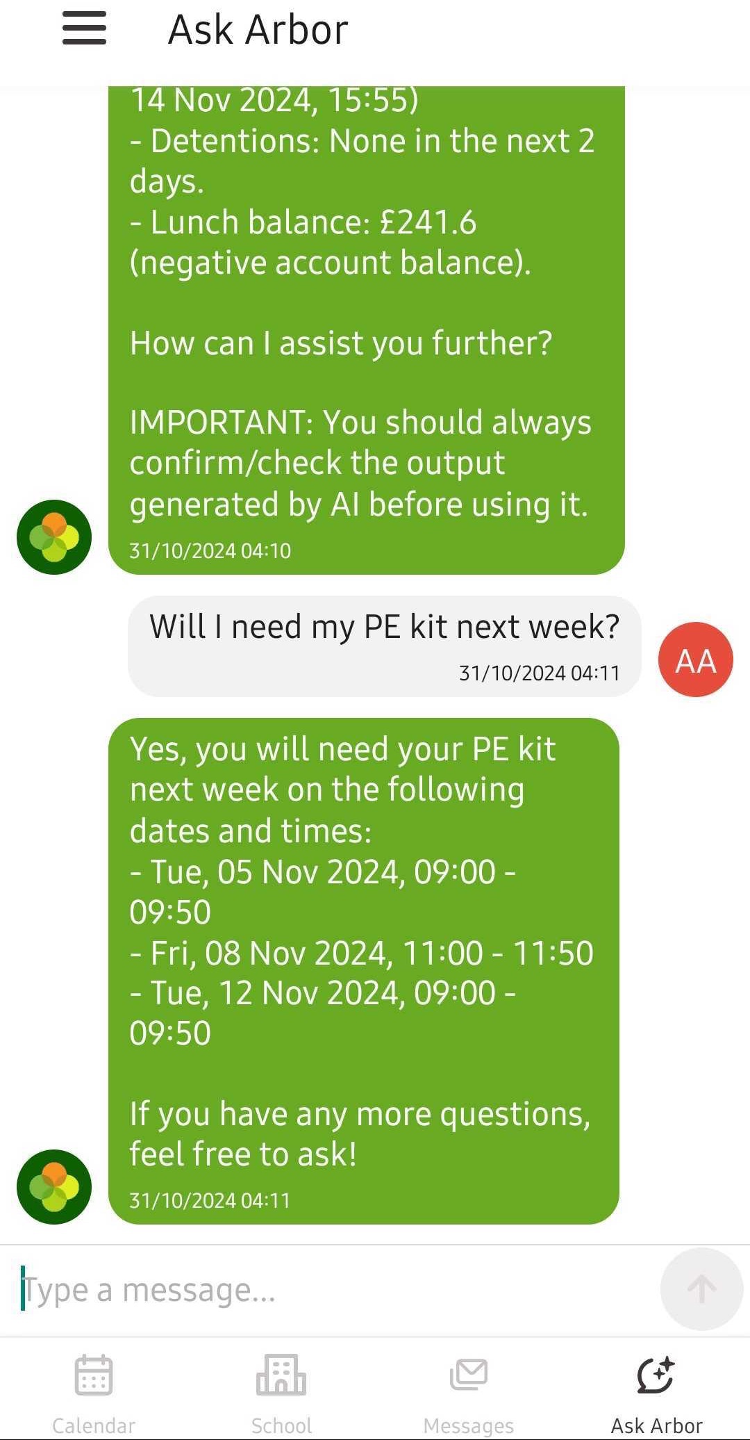Ask Arbor is a built-in AI helper that can answer questions inputted by students. Students can ask questions about upcoming lessons, and Ask Arbor will provide detailed answers advising students on what they need to know. For example, you can ask the Ask Arbor AI if you will need your P.E. kit at any point during the week, and Ask Arbor will advise you whether or not you have any P.E. lessons coming up.