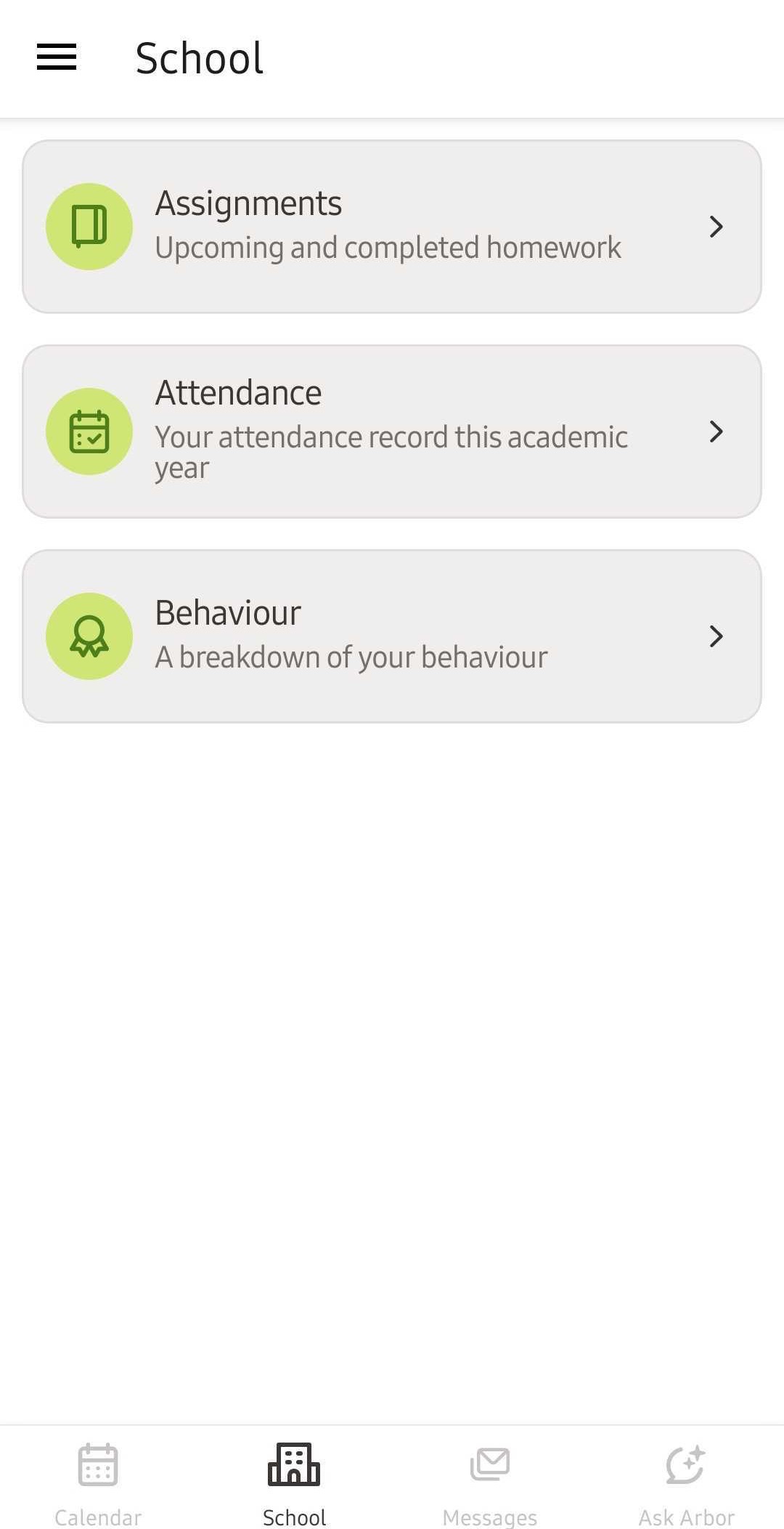 In the School section of the Student App, you can find Assignments, Attendance, and Behaviour. You can tap on these to view more information.