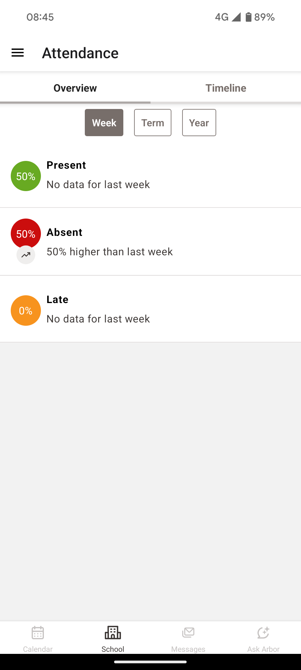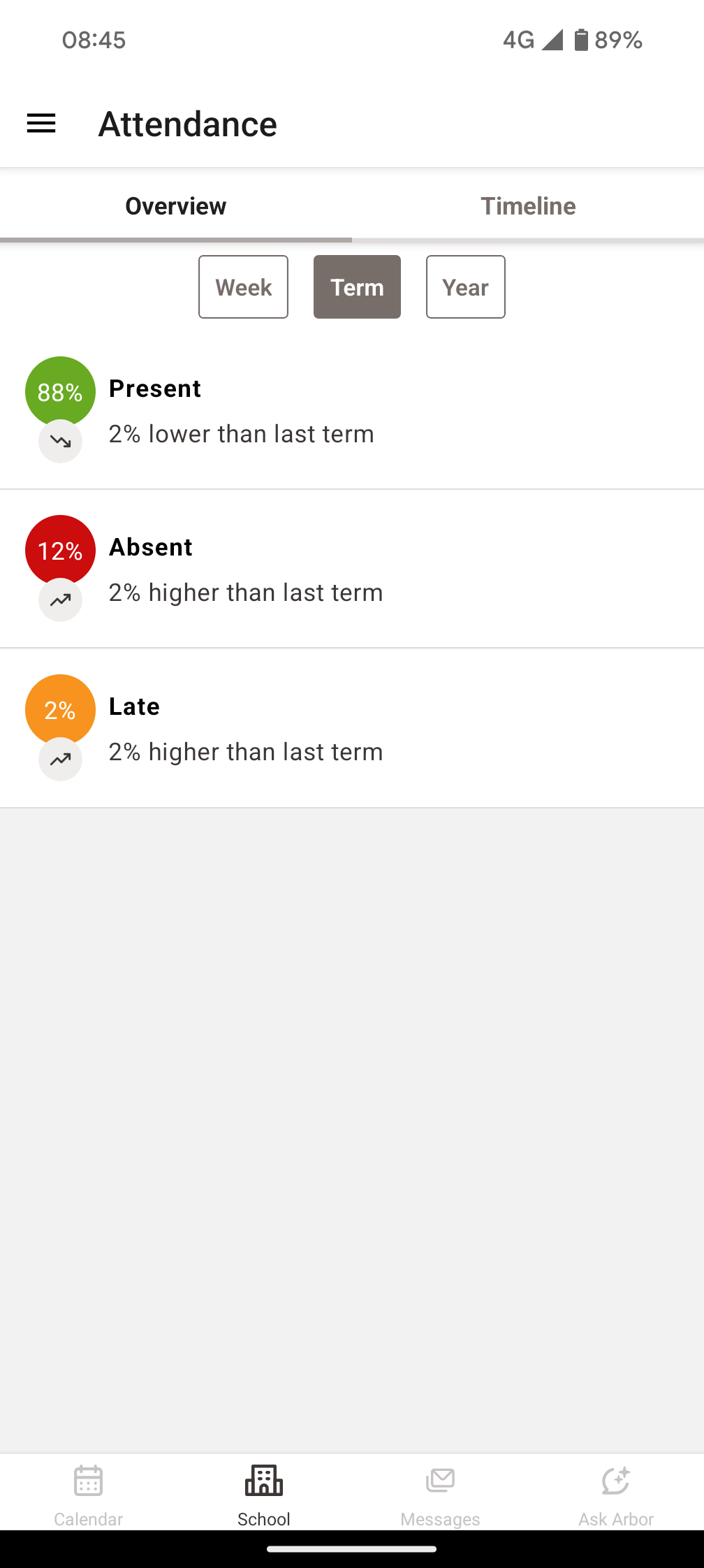 You can also tap the Week, Term, and Year buttons at the top of the page to see trends in your attendance over these time periods.