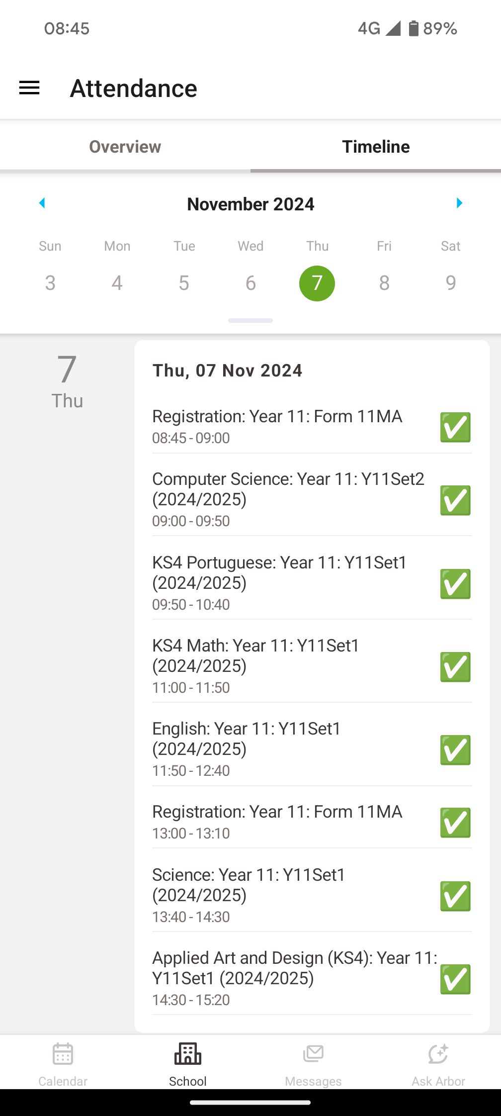 You can also see the lessons that you have attended in a list in the Timeline section at the top-right of the page. This allows you to select any date and see your attendance for each lesson on that day.