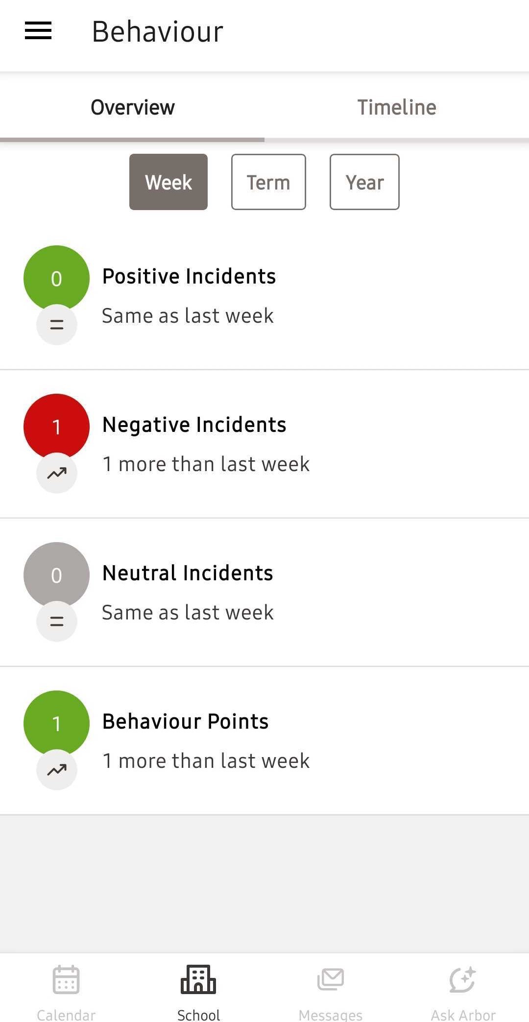 The Behaviour section of the student app allows you to see all recorded behavioural incidents, and see trends over a week, term, or year. The arrow pointing up shows an increase in recorded incidents from the last week/term/year, two horizontal lines means that the same amount of incidents were recorded, and an upwards arrow means that the amount of incidents have increased.